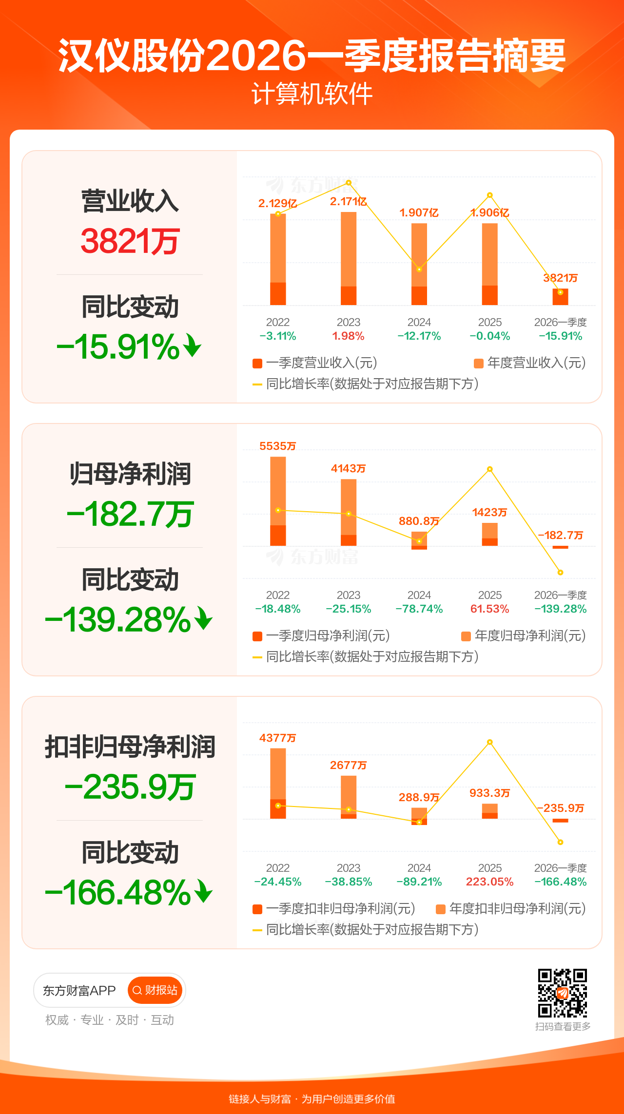 汉仪股份4月24日发布2026年一季报显示,公司一季度实现营业收入3821.19万元,同比下滑15.91%;归母净利润-182.75万元;扣非归母净利润-235.87万元。