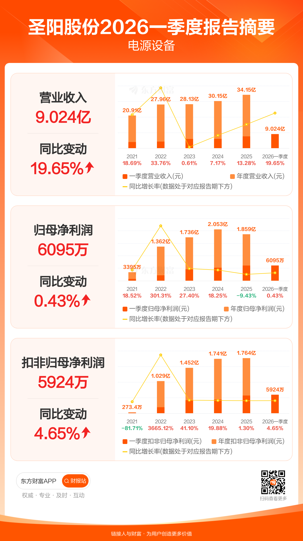 圣阳股份4月24日发布2026年一季报显示,公司一季度实现营业收入9.02亿元,同比增长19.65%;归母净利润6094.63万元,同比增长0.43%;扣非归母净利润5923.95万元,同比增长4.65%。