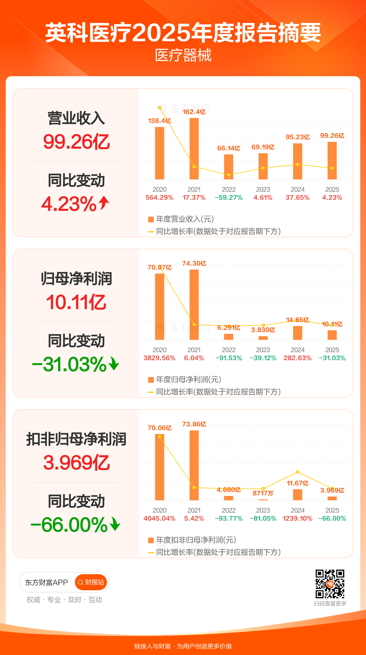 英科医疗4月24日发布2025年年报显示,公司全年实现营业收入99.26亿元,同比增长4.23%;归母净利润10.11亿元,同比下滑31.03%;扣非归母净利润3.97亿元,同比下滑66.00%。