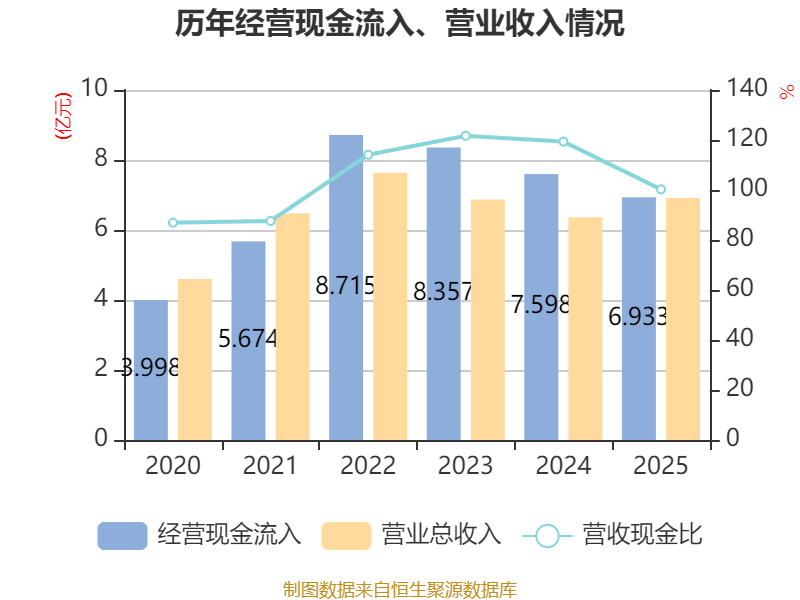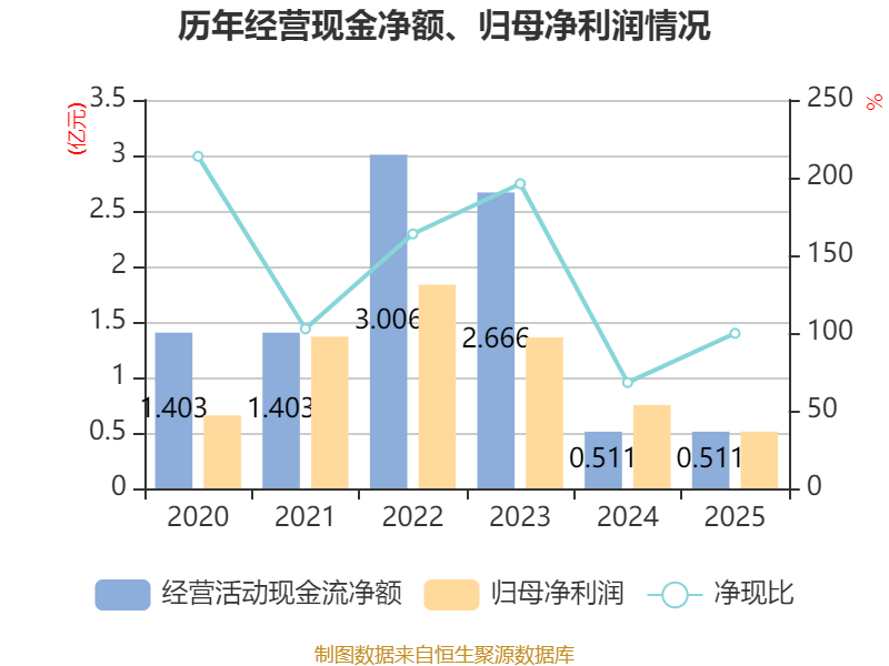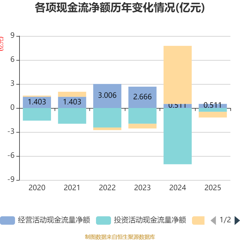 截至2025年,公司经营活动现金流净额为5111.2万元,同比下降0.03%;筹资活动现金流净额-7107.79万元,同比减少7.97亿元;投资活动现金流净额-4761.08万元,上年同期为-7.03亿元。