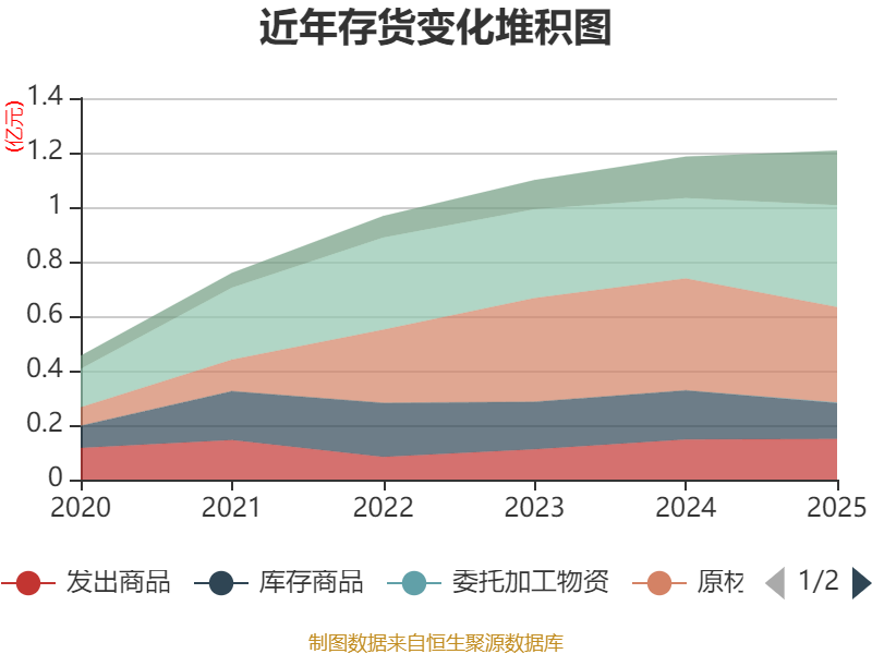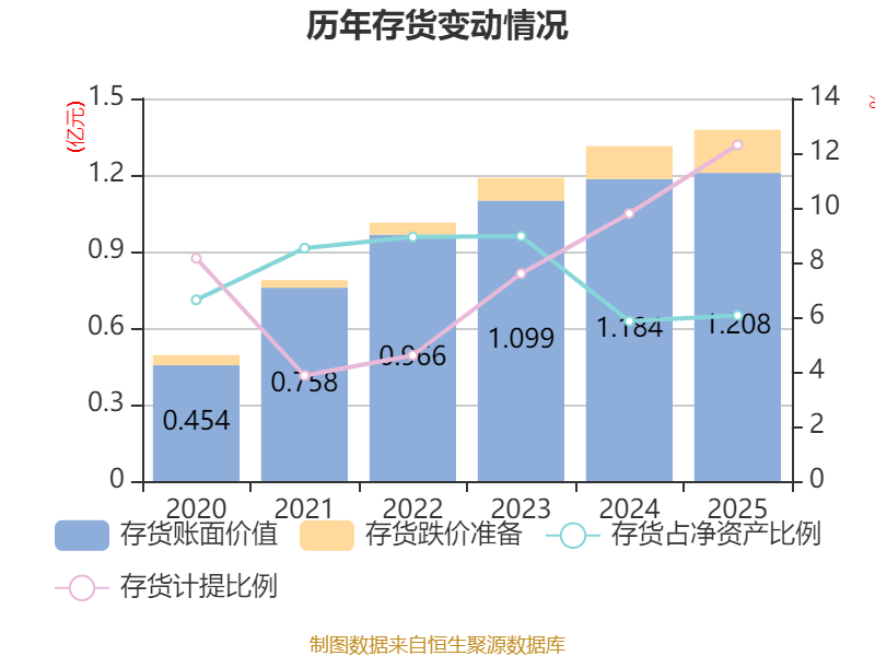 从存货变动来看,截至2025年末,公司存货账面价值为1.21亿元,占净资产的6.06%,较上年末增加232.92万元。其中,存货跌价准备为1693.56万元,计提比例为12.3%。