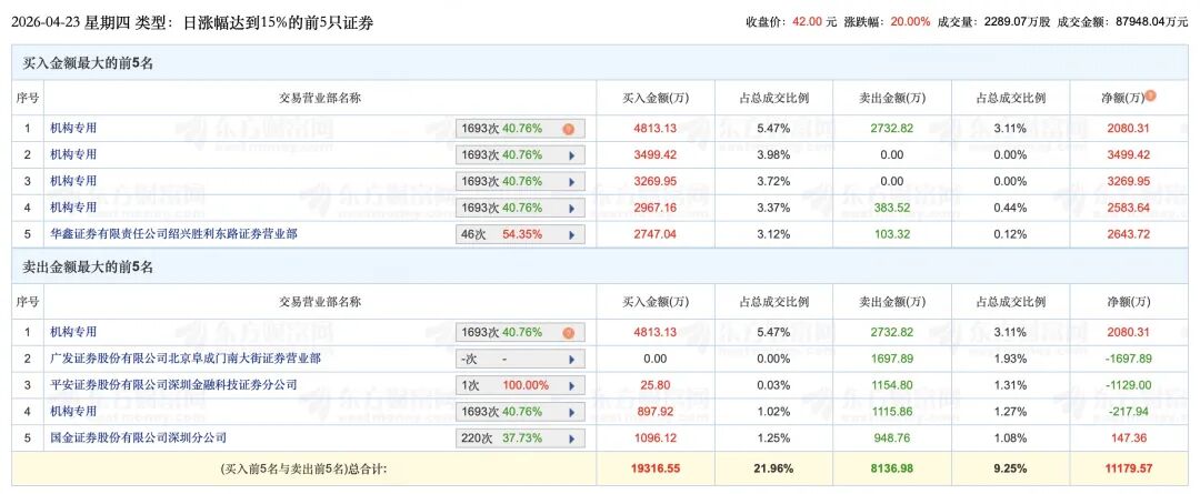 4月23日交易公开信息显示,华绿生物因属于“日涨幅达到15%的前5只证券”而上榜,买入五席中,除买五为华鑫证券有限责任公司绍兴胜利东路证券营业部(该席位为活跃的游资席位)外,其余四席均为机构席位,合计买入金额为1.54亿元。
