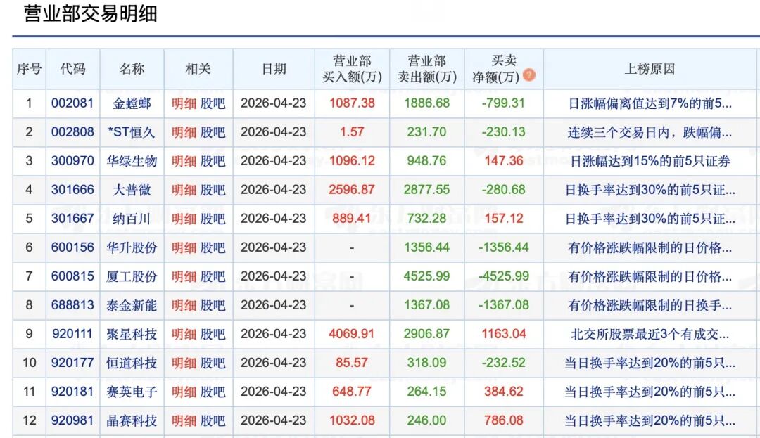 其中,卖五国金证券股份有限公司深圳分公司为知名游资席位。本周前四个交易日,该席位频繁现身金螳螂、纳百川、大普微等热门股的买卖榜单中。截至4月23日收盘,金螳螂晋级5连板。
