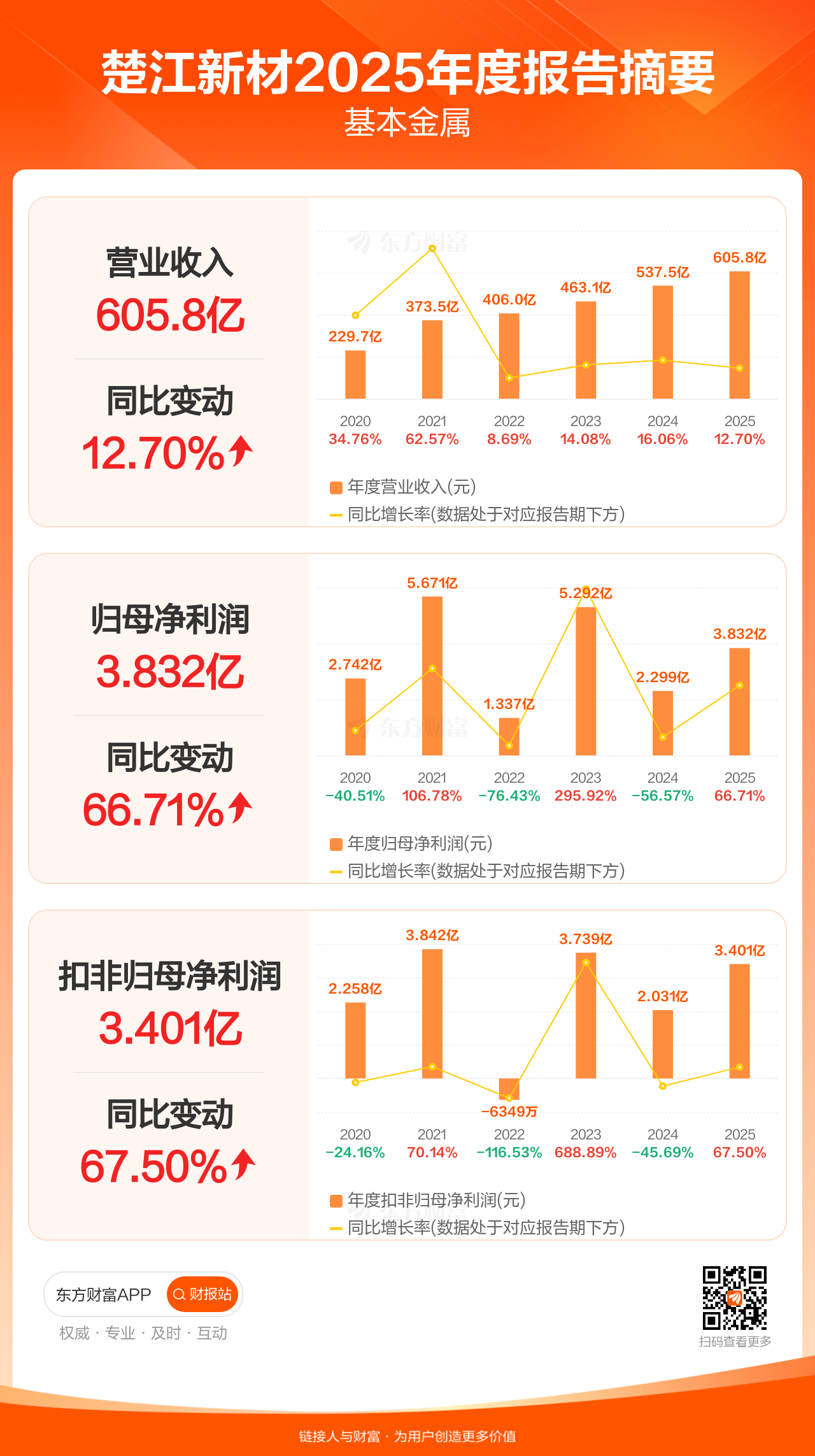 楚江新材4月25日发布2025年年报显示,公司全年实现营业收入605.77亿元,同比增长12.70%;归母净利润3.83亿元,同比增长66.71%;扣非归母净利润3.40亿元,同比增长67.50%。