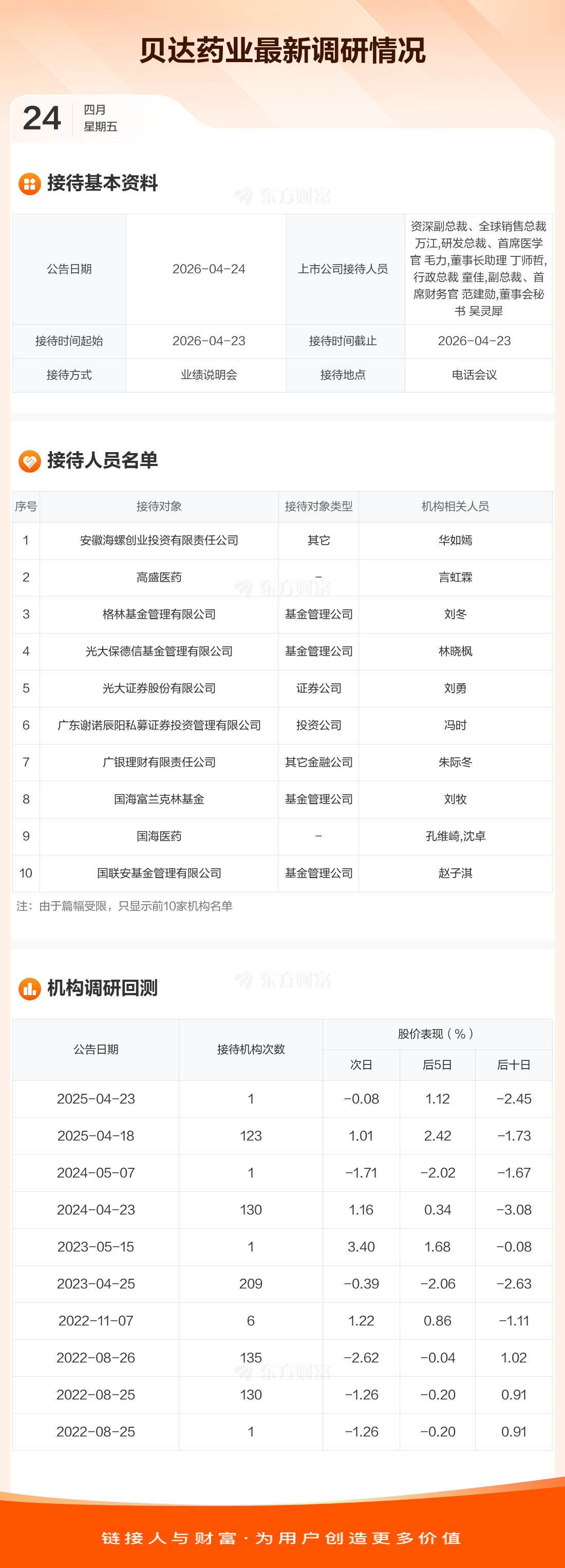 贝达药业4月24日公告称,4月23日接待安徽海螺创业投资有限责任公司等77家机构调研。接待人员包括资深副总裁、全球销售总裁 万江,研发总裁、首席医学官 毛力,董事长助理 丁师哲,行政总裁 童佳,副总裁、首席财务官 范建勋,董事会秘书 吴灵犀。
