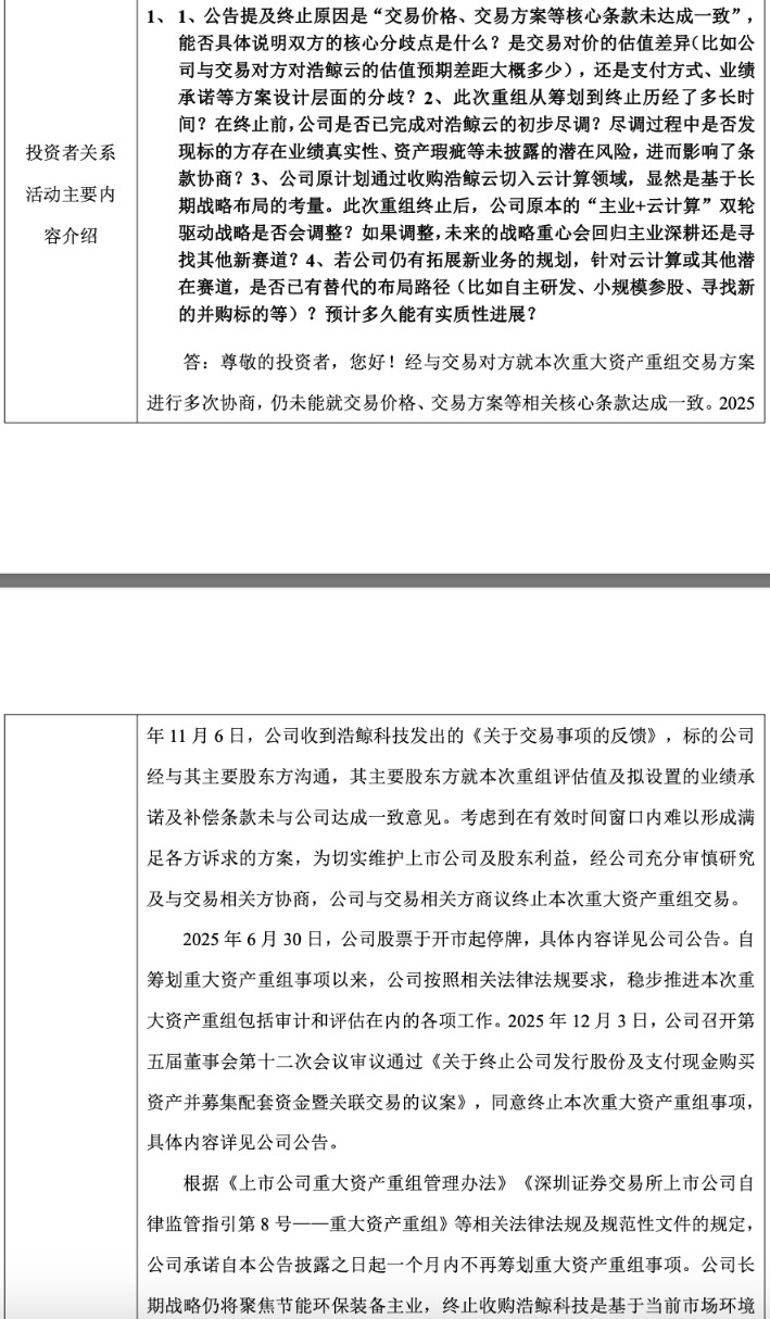 德固特在回答投资者提问时表示,经与交易对方就本次重大资产重组交易方案进行多次协商,仍未能就交易价格、交易方案等相关核心条款达成一致。2025年11月6日,公司收到浩鲸科技发出的《关于交易事项的反馈》,标的公司经与其主要股东方沟通,其主要股东方就本次重组评估值及拟设置的业绩承诺及补偿条款未与公司达成一致意见。考虑到在有效时间窗口内难以形成满足各方诉求的方案,为切实维护上市公司及股东利益,经公司充分审慎研究及与交易相关方协商,公司与交易相关方商议终止本次重大资产重组交易。