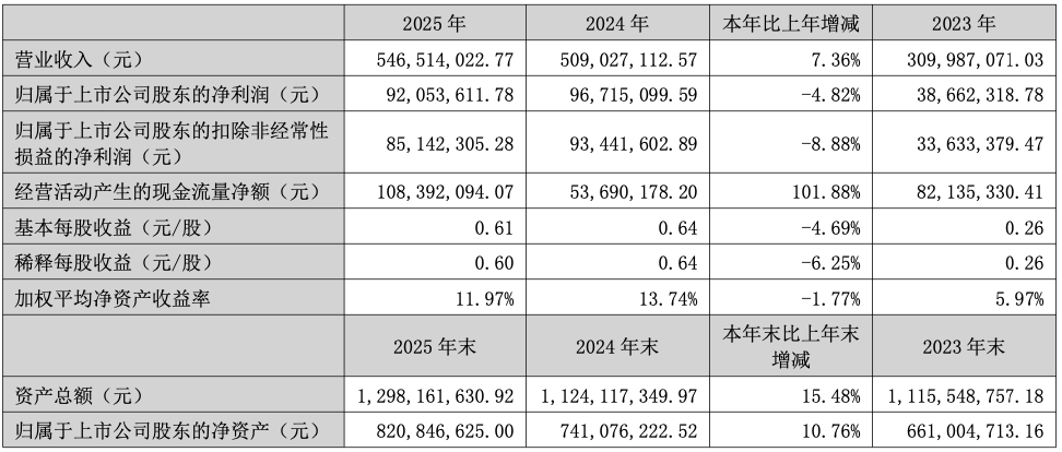 4月26日,德固特(300950)公布2025年年报,公司营业收入为5.47亿元,同比上升7.4%;归母净利润为9205万元,同比下降4.8%;扣非归母净利润为8514万元,同比下降8.9%;经营现金流净额为1.08亿元,同比增长101.9%。